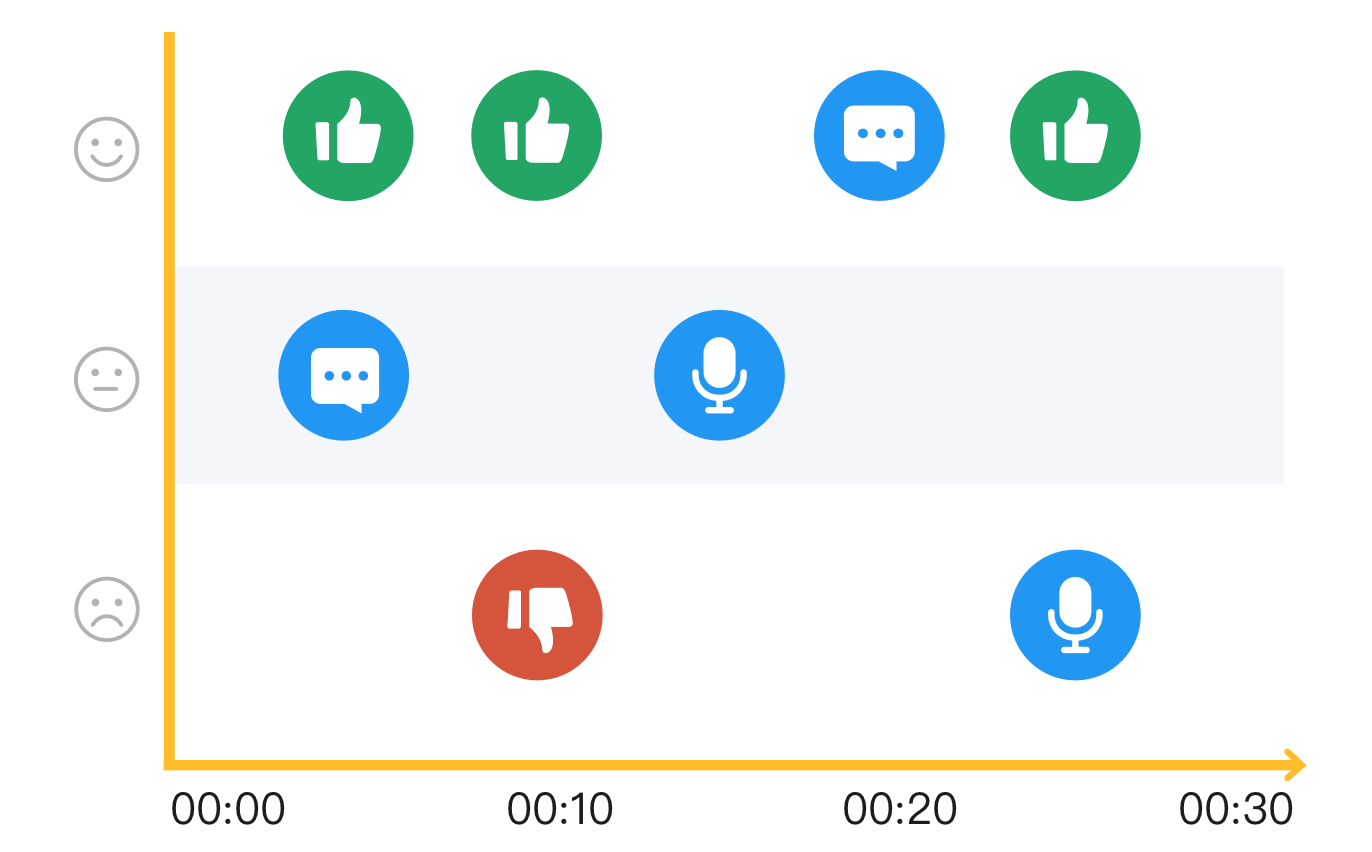 総合的なフィードバックだけでなく、UMUなら動画タイムラインでタイミングに合わせて「いいね」や音声・テキストによるフィードバックが可能です。